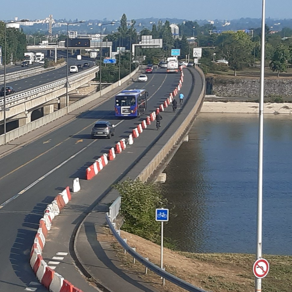 Avant la crise COVID, pas moins de 10 voies de circulations (6 pour l’A10 ; 4 pour le pont d’Arcole) permettaient aux véhicules motorisés d’enjamber le Cher contre seulement 2 trottoirs (dont 1 conseillé pour les cyclistes, avec pied à terre obligatoire).