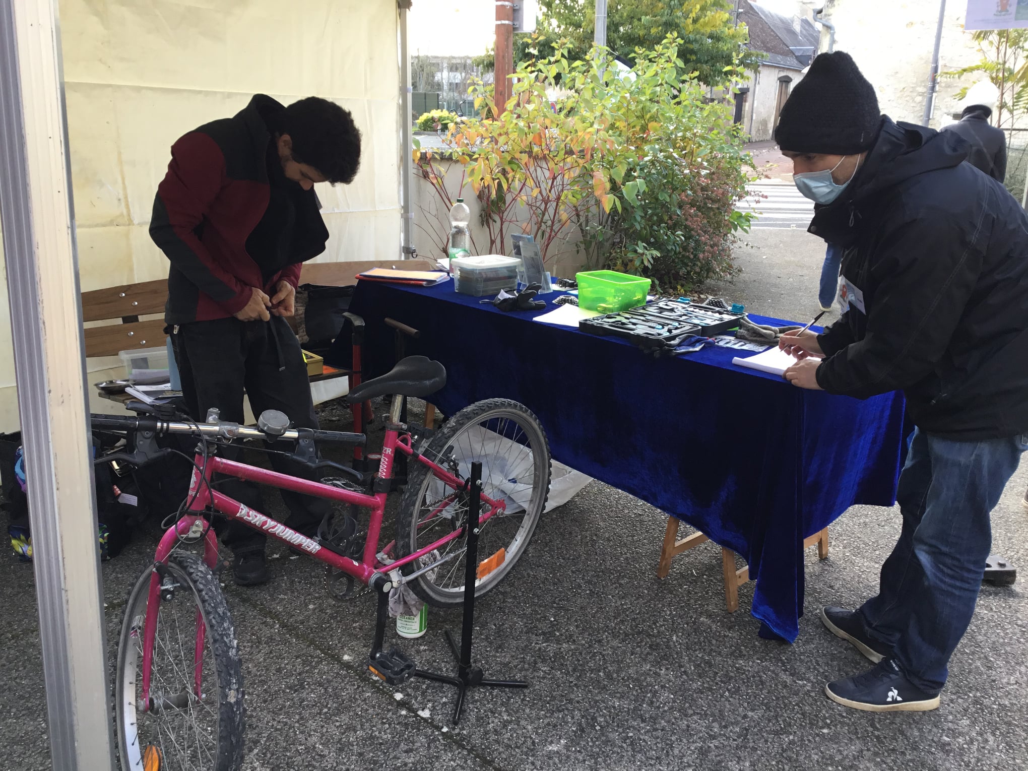 Formation aux contrôles techniques d’Alexandre (de l’antenne de Montlouis) par François, administrateur et responsable de l’atelier d’autoréparation du Collectif Cycliste 37.
