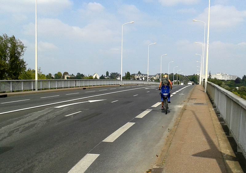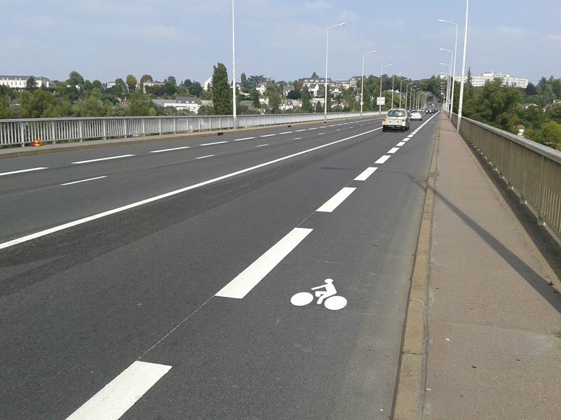 Mais depuis quelques jours, une réorganisation des voies a été mise en pratique par la Ville de Tours. Les voies « voitures » ont perdu du gras si l’on ose dire, et l’espace libéré a été utilisé pour créer une bande cyclable sur la totalité du pont Mirabeau, sens Sud/Nord. Voici un exemple remarquable où l’on redistribue l’espace en fonction des usages, le tout à peu de frais. Les cyclistes peuvent ainsi rouler de façon plus sereine, les voies « voitures » plus étroites appellent moins les automobilistes à appuyer sur l’accélérateur, et les piétons profitent eux aussi de ce nouvel aménagement : la bande cyclable éloigne en effet le trafic motorisé du trottoir Est et leur permette de respirer un peu moins de gaz d’échappement.