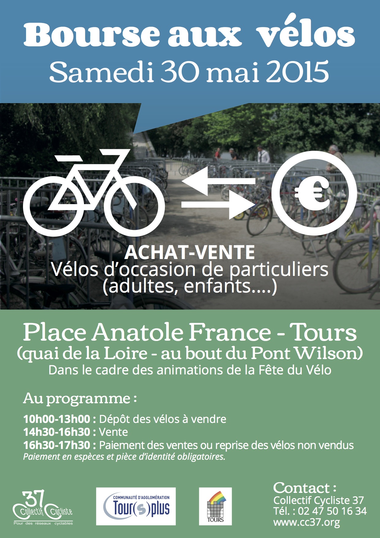Samedi 30 mai 2015, place Anatole France, à Tours : bourse aux vélos d’occasion de particuliers
