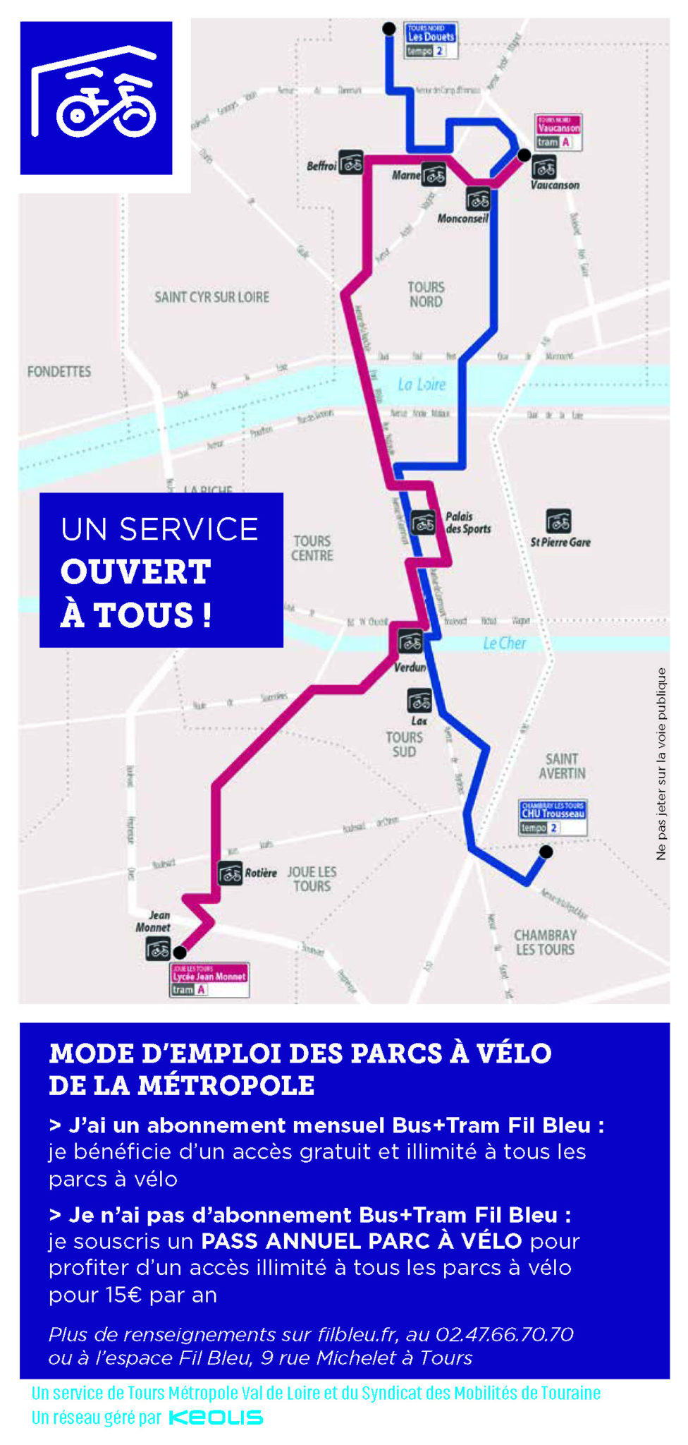Le 18 juillet 2019 étaient inaugurés deux nouveaux parkings à vélos sécurisés d’une trentaine de place chacun, l’un à proximité du centre aquatique du Lac (Tours sud), l’autre au centre municipal des sports (Tours centre), tous deux situés sur le parcours du tram. L’installation d’un nouvel abri vélo sécurisé est à l’étude sur le secteur de Velpeau. Ces réalisations portent à dix le total des abris vélos sécurisés sur le territoire de l’agglomération tourangelle pour un total d’environ 400 places de stationnement.