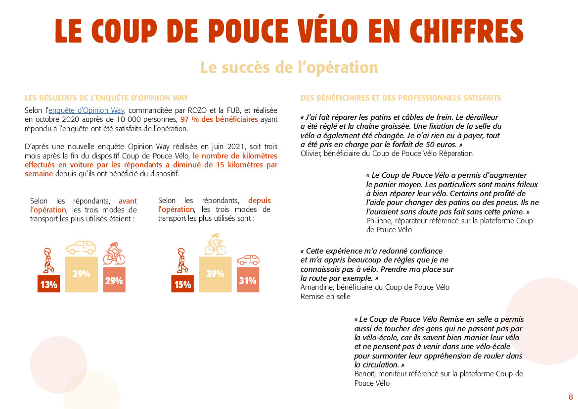 Outre ces résultats chiffrés, le Coup de Pouce Vélo a permis de reconsidérer durablement la place du vélo dans les modes de déplacement des Françaises et Français. En effet, d’après les enquêtes d’Opinion Way commandées par la FUB et par ROZO et menées en novembre 2020 pour mesurer le taux de satisfaction des bénéficiaires du dispositif et l’évolution de leur mode de déplacement, il apparaît que 52 % des personnes interrogées pratiquent plus régulièrement le vélo et que 36 % recourent moins souvent à la voiture.