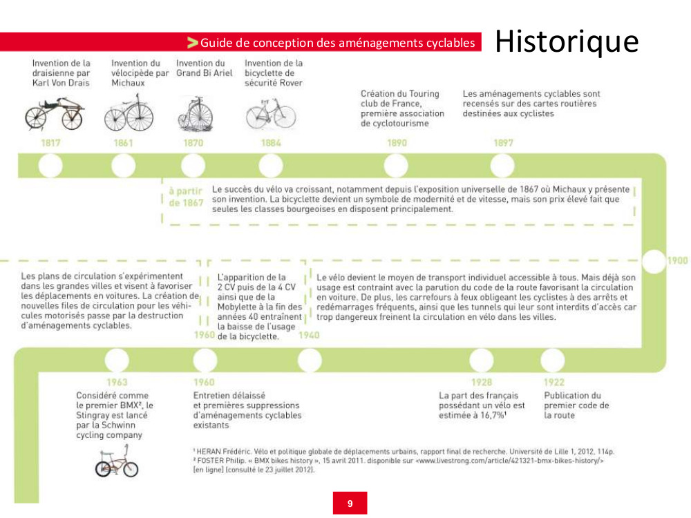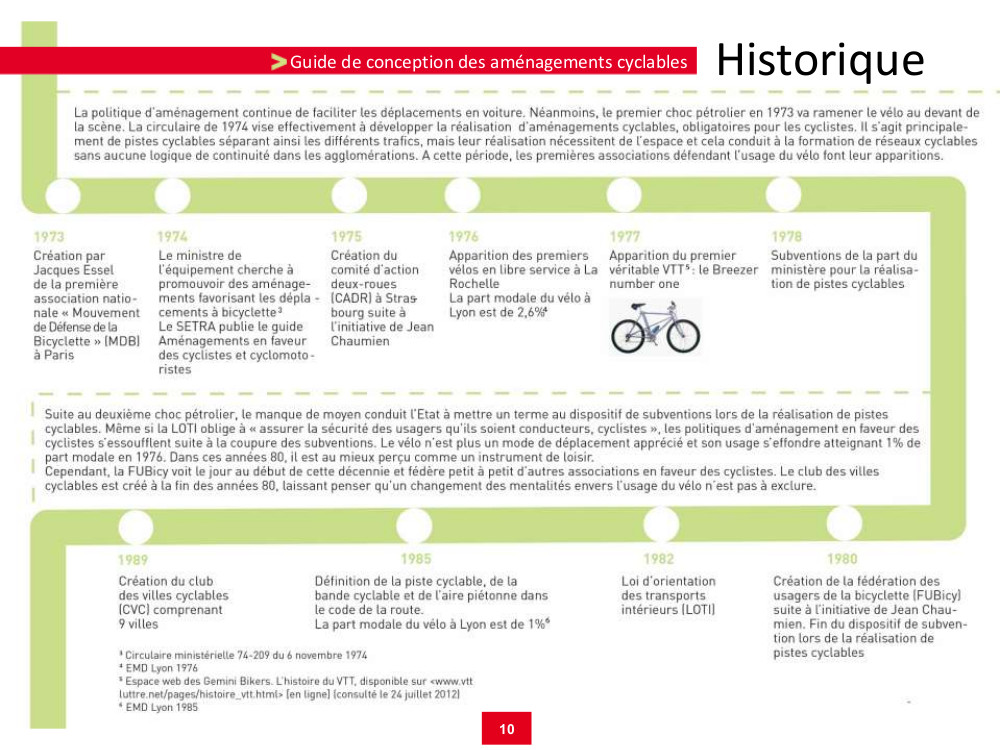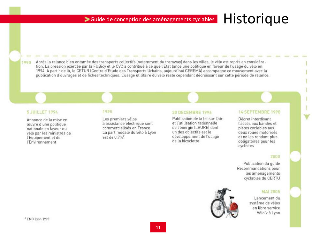 Une frise historique présente l’évolution du vélo et des politiques cyclables depuis son invention jusqu’à nos jours, avec un focus sur l’agglomération [lyonnaise – cf. ci-dessous].