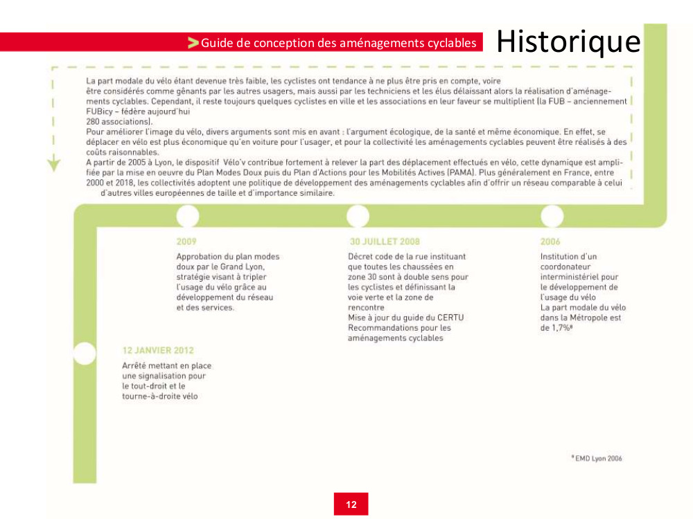 “Après un premier guide technique réalisé en 1998 en accompagnement de la Charte du vélo, puis une première version du guide pour la conception des aménagements cyclables éditée en mars 2013, ce troisième guide intervient dans un nouveau contexte en termes d’évolutions importantes de la réglementation, de fort développement des usages cyclistes sur l’ensemble des territoires de l’agglomération et d’ambition de la Métropole dans le cadre de son nouveau Plan d’actions pour les mobilités actives.