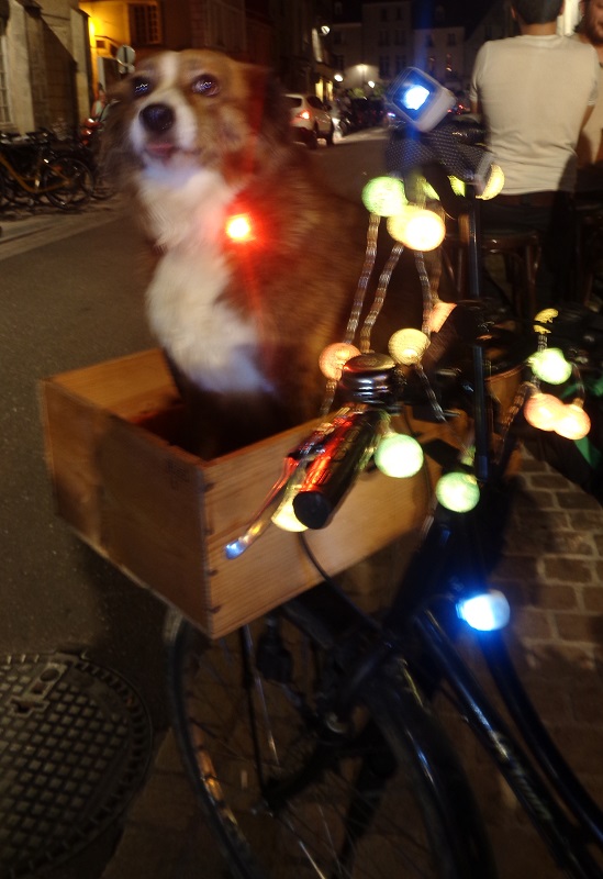 Un chien (ou une chienne) amateur(trice) de balades transporté(e) par sa maîtresse dans une caisse en bois à l’avant d’un joli vélo vintage