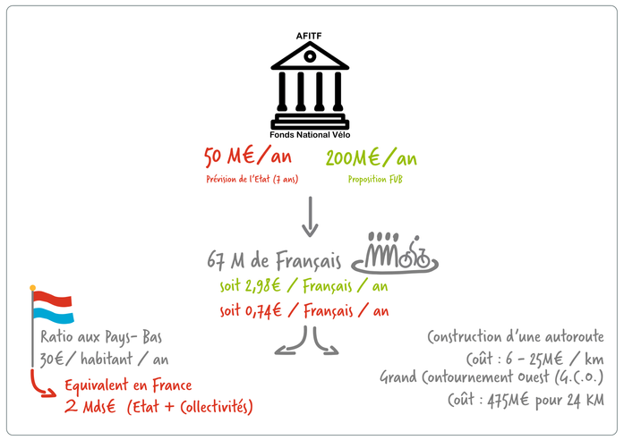 Le « SystèmeVélo » néerlandais est le fruit d’investissements massifs :  plus de 30 €/habitant/ an depuis 30 ans. Pour la France l’équivalent donnerait donc pas moins de 2 milliards d’€/an! Nous proposions que l’Etat soutienne les collectivités à hauteur de 200 M€/an. Le Premier Ministre en a promis 50, rappelez le aux députés. En effet, pour que le vélo soit bénéfique pour toutes et tous, il faut investir pour créer rapidement des réseaux cyclables fonctionnels sécurisés et cohérents.