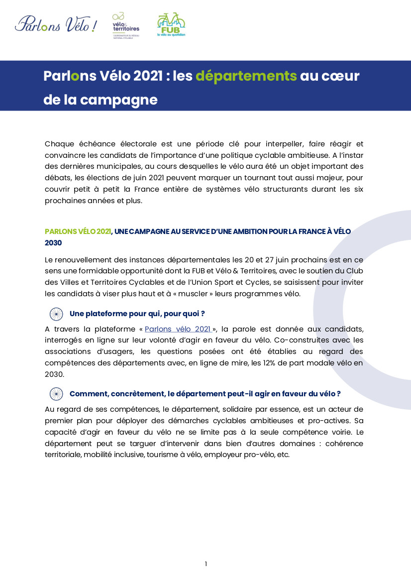 Fin avril, la FUB et Vélo & Territoires lançaient la plateforme « Parlons Vélo 2021 », avec le soutien du Club des villes et territoires cyclables et l’Union Sport et Cycle. À travers un questionnaire en ligne, l’outil permet d’interroger les binômes candidats aux départementales et les têtes de liste des régionales quant à leur engagement en faveur des politiques cyclables.